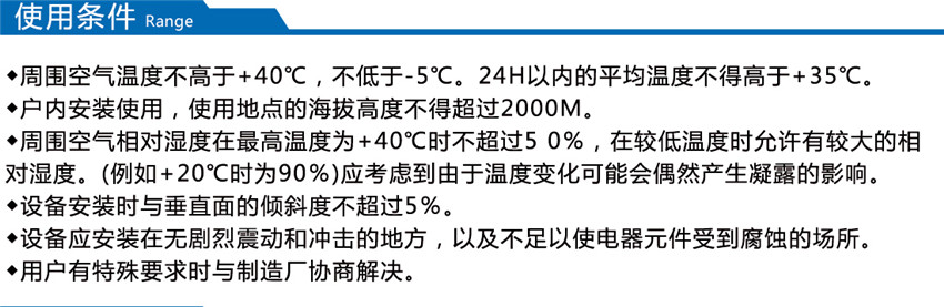 裝置適用于發(fā)電廠、石油、化工、冶金、紡織、高層建筑等低壓配電系統(tǒng)。海拔高度不超過(guò)1000m;周圍環(huán)境溫度-25℃ - +40℃;無(wú)導(dǎo)電性塵埃、腐蝕性氣體和水蒸氣的場(chǎng)所;無(wú)火災(zāi)和爆炸危險(xiǎn)的場(chǎng)所;無(wú)經(jīng)常性劇烈震動(dòng)場(chǎng)所。