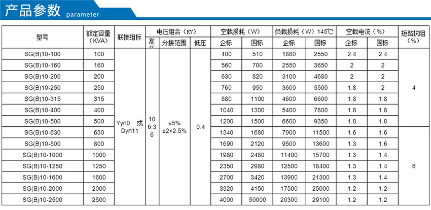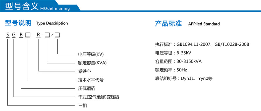 產(chǎn)品型式為H級、戶內(nèi)、三相、雙繞組、非包封型(SGB)節(jié)能型干式變壓器