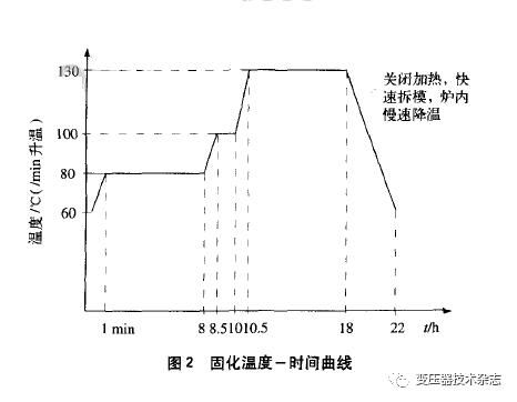 澆注好的模具必需在固化爐內(nèi)依照固化溫度一時候曲線停止加熱固化。進程中,需包管固化爐內(nèi)溫度平均。固化溫度~時候曲線如圖2所示。