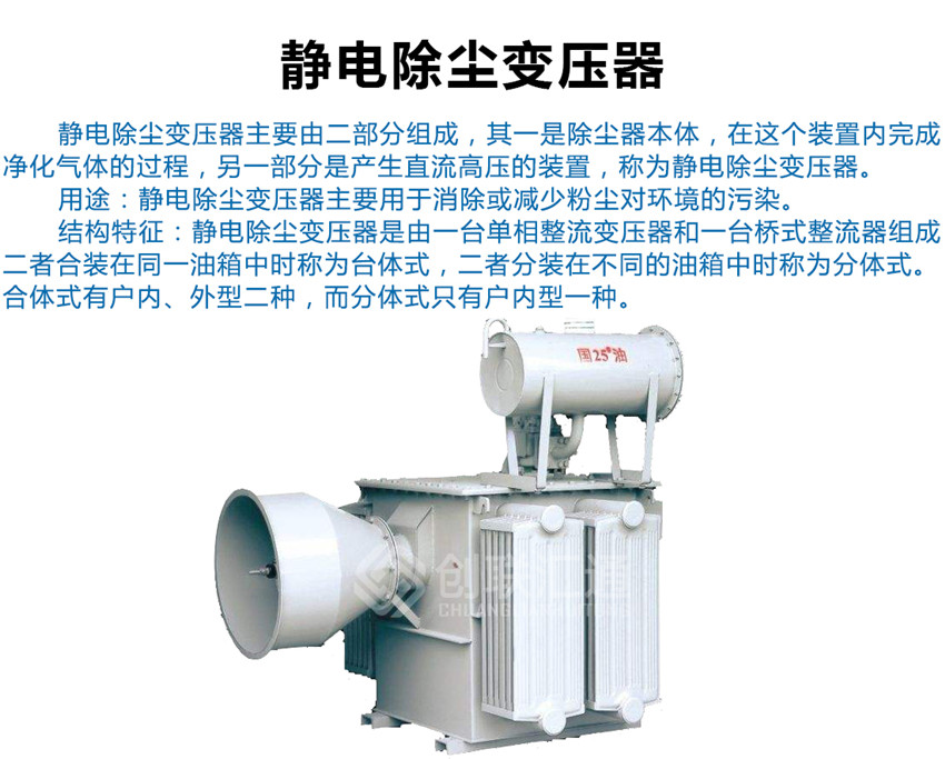 靜電除塵變壓器適合于工業(yè)部門的除塵、除霧、脫水、雜質(zhì)分離和回收稀有金屬及其他原料等方面應(yīng)用。